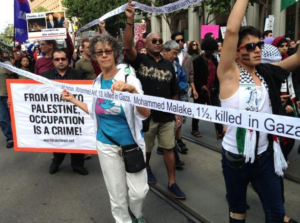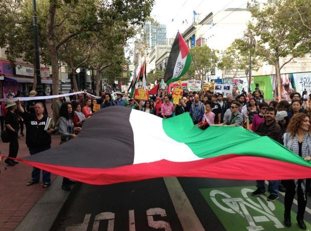 The afternoon protest was organized by the Arab Resource and Organizing Center (AROC) and Arab Youth Organization. Protesters traveled from throughout northern California to participate in what turned out to be the city’s largest pro-Palestinian protest since Israel’s 2008-2009 Cast Lead invasion of Gaza.The demonstrators, who included many Arab Americans and representatives from a wide spectrum of progressive groups, gathered in Justin Herman Plaza to listen to pro-Palestinian speakers before marching down Market Street to Civic Center Plaza chanting slogans like “free, free Palestine” and “stop killing children.”