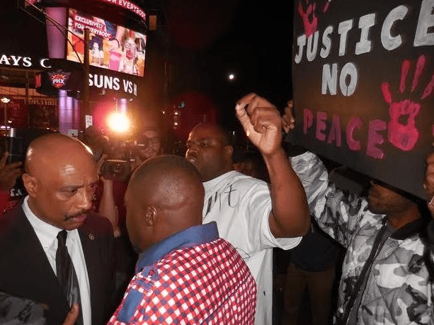 A group of several dozen demonstrators holding signs and chanting slogans like “hands up, don’t shoot” and “black lives matter” rallied and marched peacefully through downtown Phoenix, blocking train tracks and staging ‘die-ins’ outside the US Airways Center during a Phoenix Suns basketball game. The protesters demanded Officer Rine’s “badge, gun and job” and said they would press the issue at an upcoming City Council meeting on December 17.