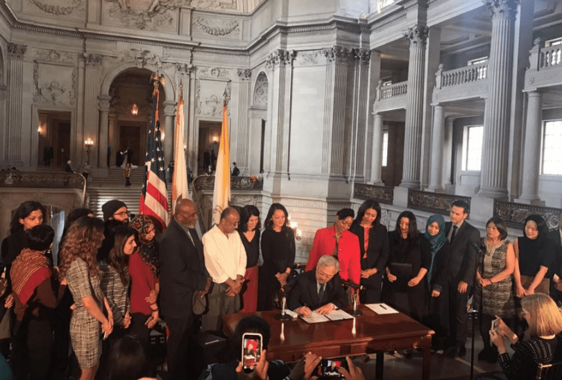 Prior to the mayor’s signing, the ordinance, which was introduced by Lee and District 10 Supervisor Malia Cohen, had been approved in a unanimous 11-0 Board of Supervisors vote. “We are doing this because the Muslim community and the immigrant community in general across the United States is facing dangerous discrimination by the government of the United States,” District 9 Supervisor Hillary Ronen explained last month while working on the measure.