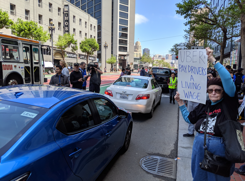 Holding up a sign lamenting that most drivers got nothing while Uber executives and other high-level investors stand to reap massive windfalls come Friday’s Uber initial public offering, Ann Glatt said she’s “gotten nothing” from the IPO after driving for Lyft for four years. Like many drivers, Glatt said she’s seen her pay decrease, even as she drives longer hours. “In the last few months [pay] has really gone down,” she added.