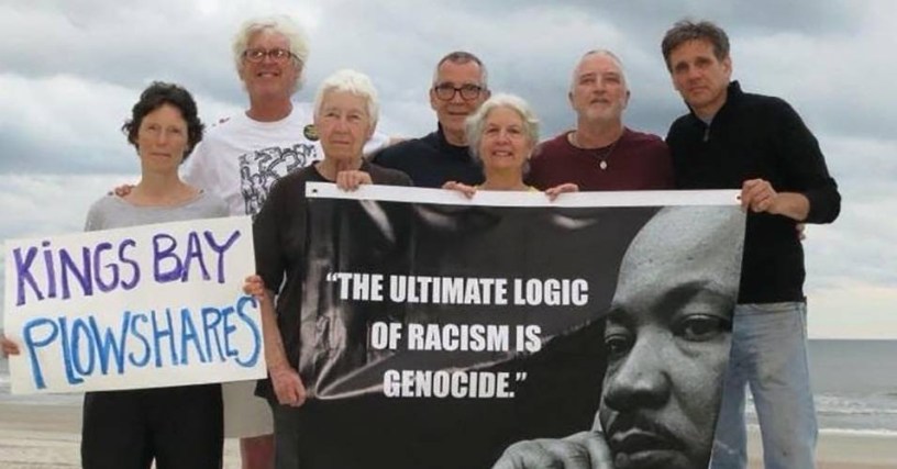 On April 4, 2018—the 50th anniversary of King’s assassination—Grady, Hennessy, Kelly, Trotta, and Kings Bay Plowshares 7 activists Mark Coalville, Liz McAlister, and Patrick O’Neill entered the base, splashed baby bottles containing their own blood on a wall, spray-painted an anti-war slogan on a sidewalk, and hammered away at a monument to nuclear war.
